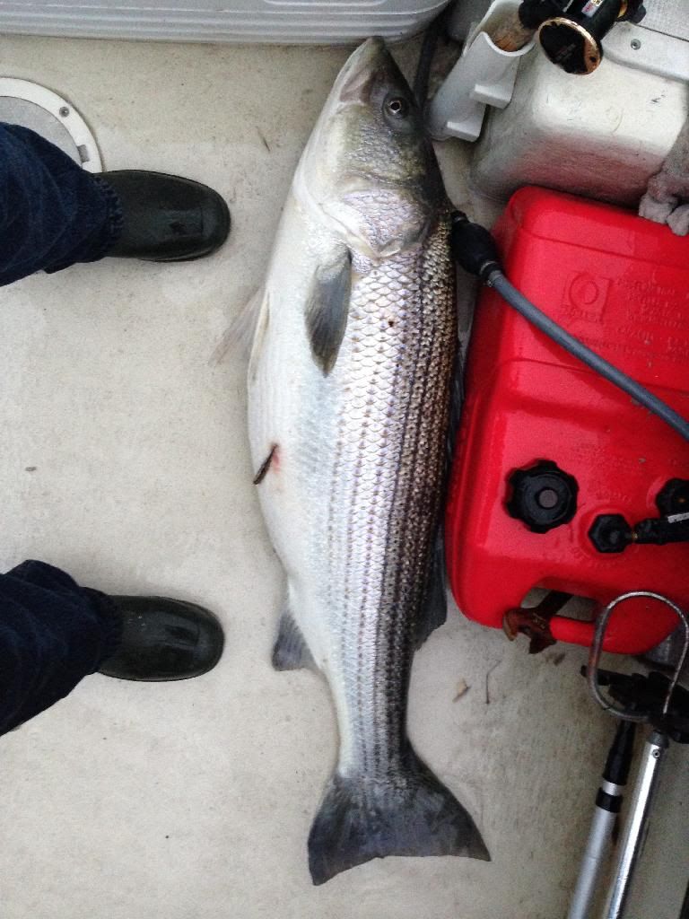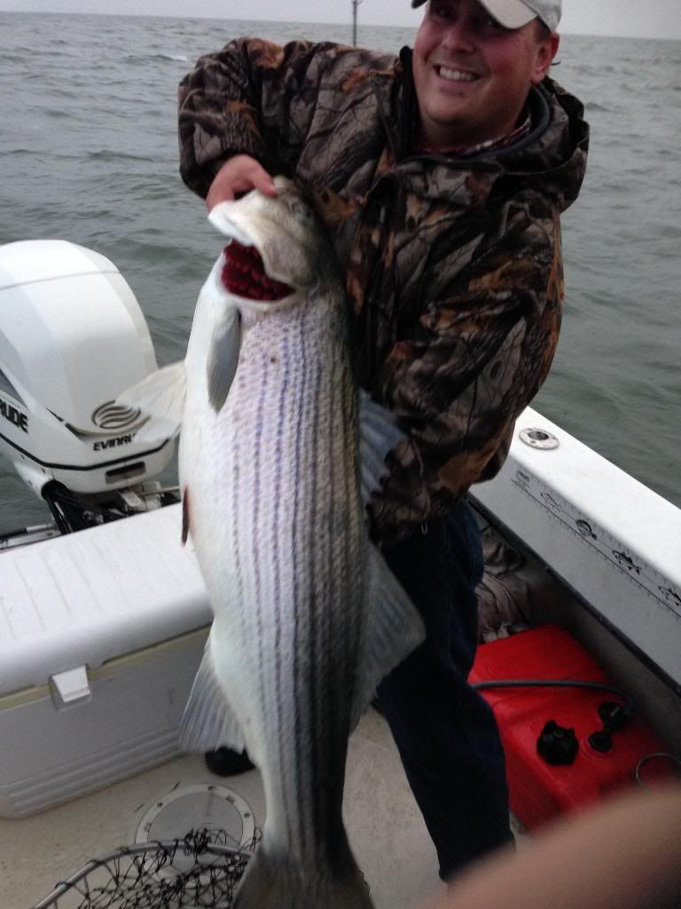 Got a late start today with Sean and Anthony out of Messick. We got to the ES around 3:00, and made one unsuccessful drift. We repositioned and I must have smacked this fish in the head with the eel, as it started running before my line stopper even pulled tight to the float. Got an instant hookup and it was on. Of course the bearings in my reel decided to **** out at the worst possible time... But after lots of cranking, when the dust settled we had a 45" fish on the deck! Had a super-old deteriorated tag in it too. We made a few more drifts with no joy, then headed back across the bay around 8:30, which wasn't as rough as we thought it would be thankfully. Was a great evening on the water, and I'm happy to check off another first with a big rockfish - it's been a great first year of fishing for me in Virginia! Best of luck when you go!